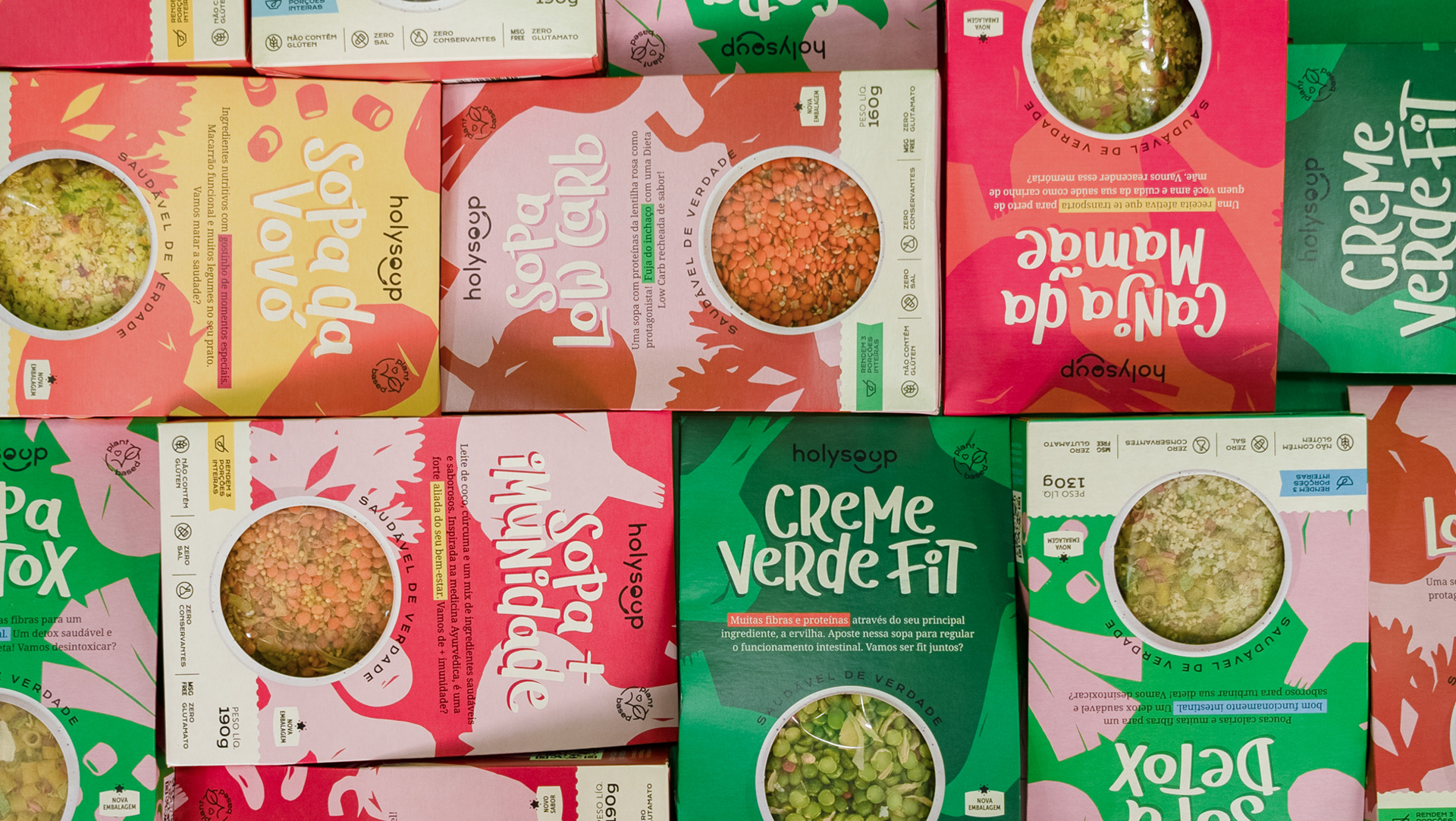 {FEITO EM PARCERIA COM A MELT® DESIGN} A Holy Soup é uma marca descomplicada que surgiu para tornar as refeições mais práticas, gostosas e saudáveis - a opção perfeita para quem tem uma vida corrida e precisa de facilidade no dia-a-dia. As sopas fizeram tanto sucesso que eles sentiram que estavam precisando de um novo visual. O novo design traz letterings exclusivos, ilustrações personalizadas e cores que possibilitam inúmeras combinações. A embalagens secundárias foram desenvolvidas especialmente visando a proteção do conteúdo, já que o saco plástico adotado anteriormente muitas vezes falhava nessa função. Além disso, o visor ajuda a sanar a curiosidade de consumidores que querem ver o produto, antes de decidir pela compra.